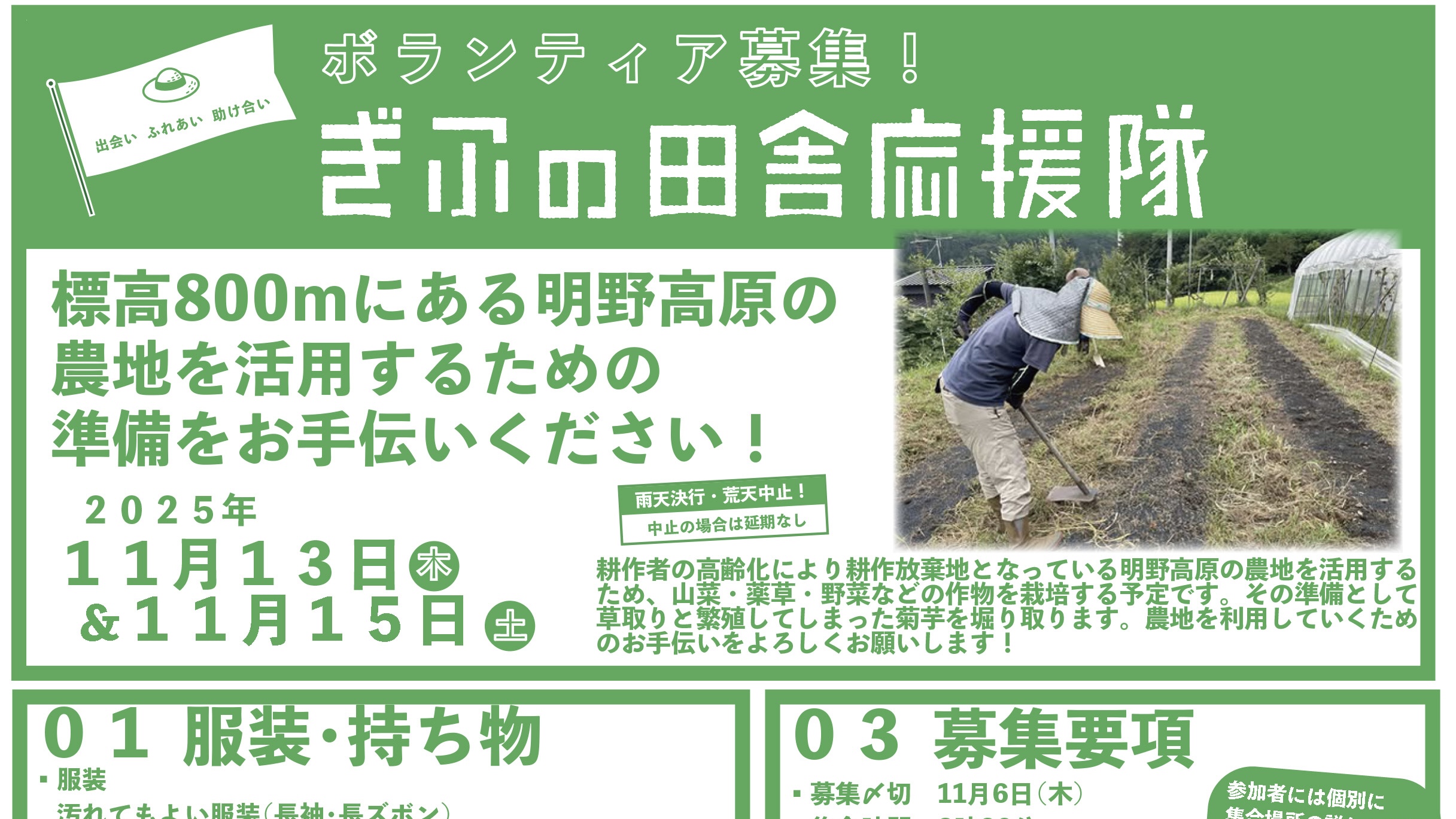 11月13日&15日標高800mにある明野高原の農地を活用するための準備をお手伝いください! ぎふの田舎応援隊 […]