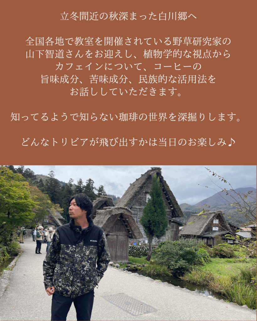 🍁冬が近づく白川郷です。温かい格好で、また展望台で散策したり山本屋まで歩きますので動きやすい服や靴をお選びください。みなさんで奥深い珈琲の世界を楽しみましょう。