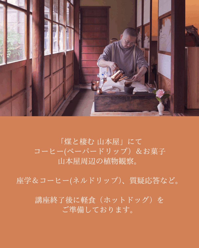 「煤と棲む 山本屋」にてコーヒー(ペーパードリップ)とお菓子を楽しみ、野外にて山本屋周辺の植物観察。その後は座学&コーヒー(ネルドリップ)、質疑応答など。