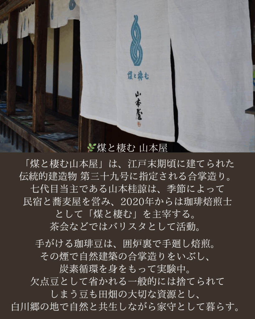 手がける珈琲豆は、囲炉裏で手廻し焙煎。その煙で自然建築の合掌造りをいぶし、炭素循環を身をもって実験中。欠点豆として省かれる一般的には捨てられてしまう豆も田畑の大切な資源とし、白川郷の地で自然と共生しながら家守として暮らす。